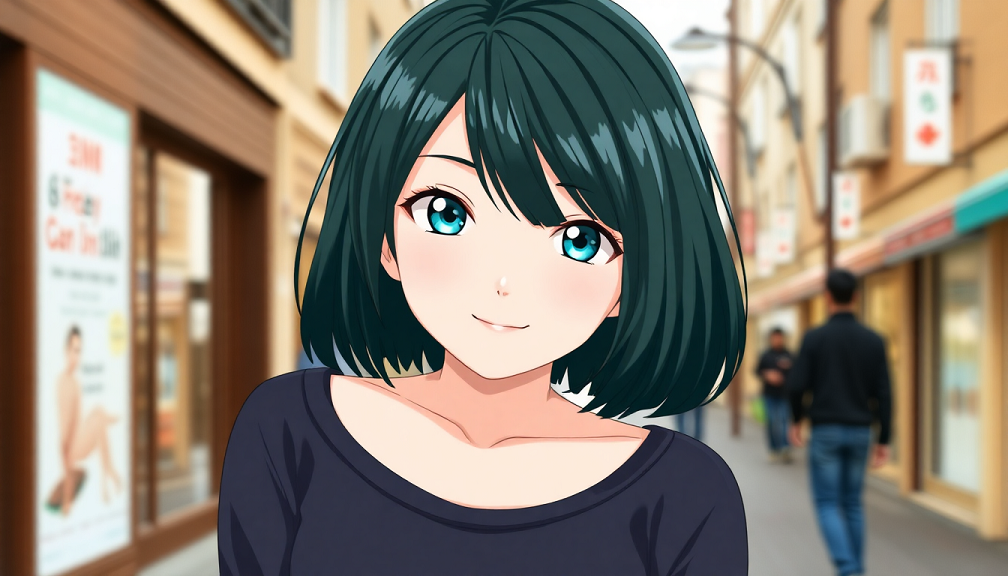"SHERIN, anime style, hentai style, flat color, cel shaded, 2D, hard lines, drawn street background, sharp focus, no bokeh, no blur, 1girl, dark-teal short hair, teal eyes, medium breasts, cleavage, casual clothes, smile"
