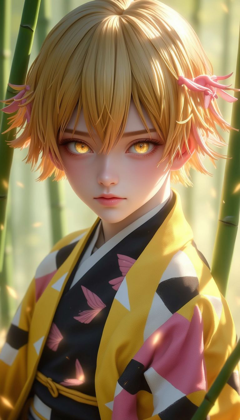 Generate realistic images of a character that fuses Nezuko and Zenitsu from Demon Slayer from a text prompt. Optionally...